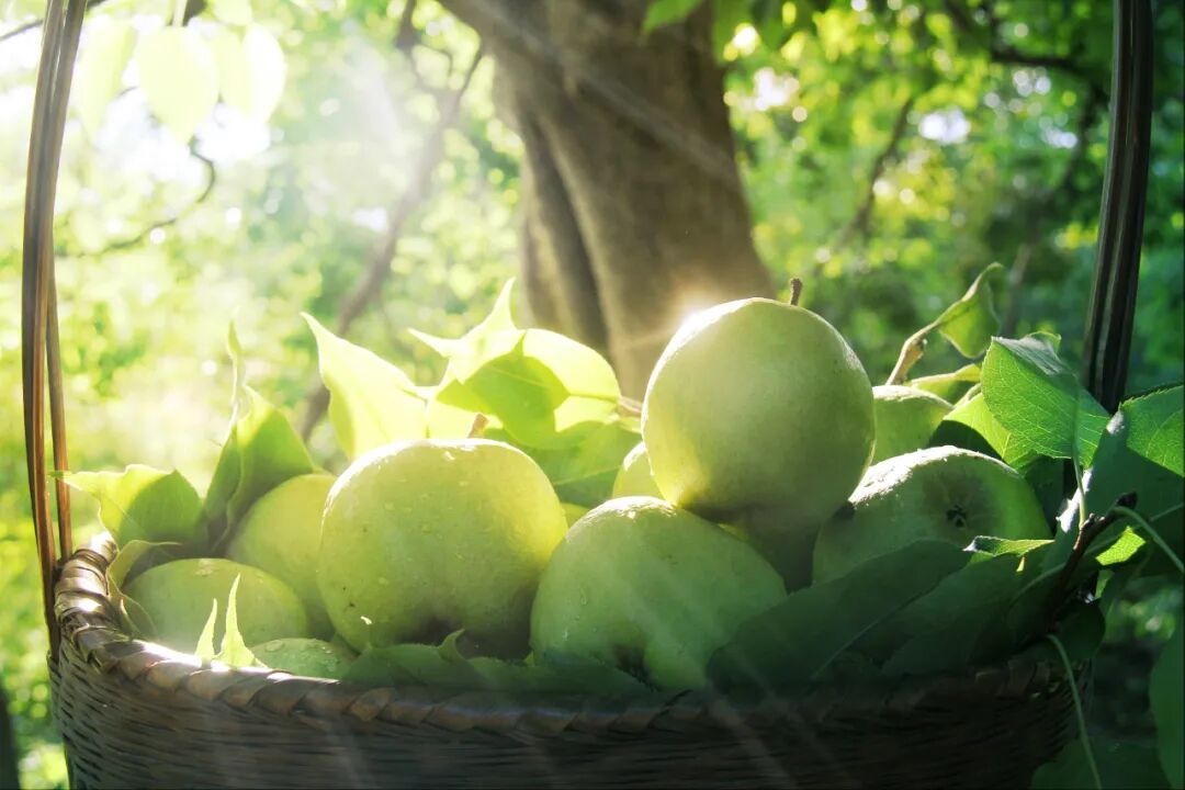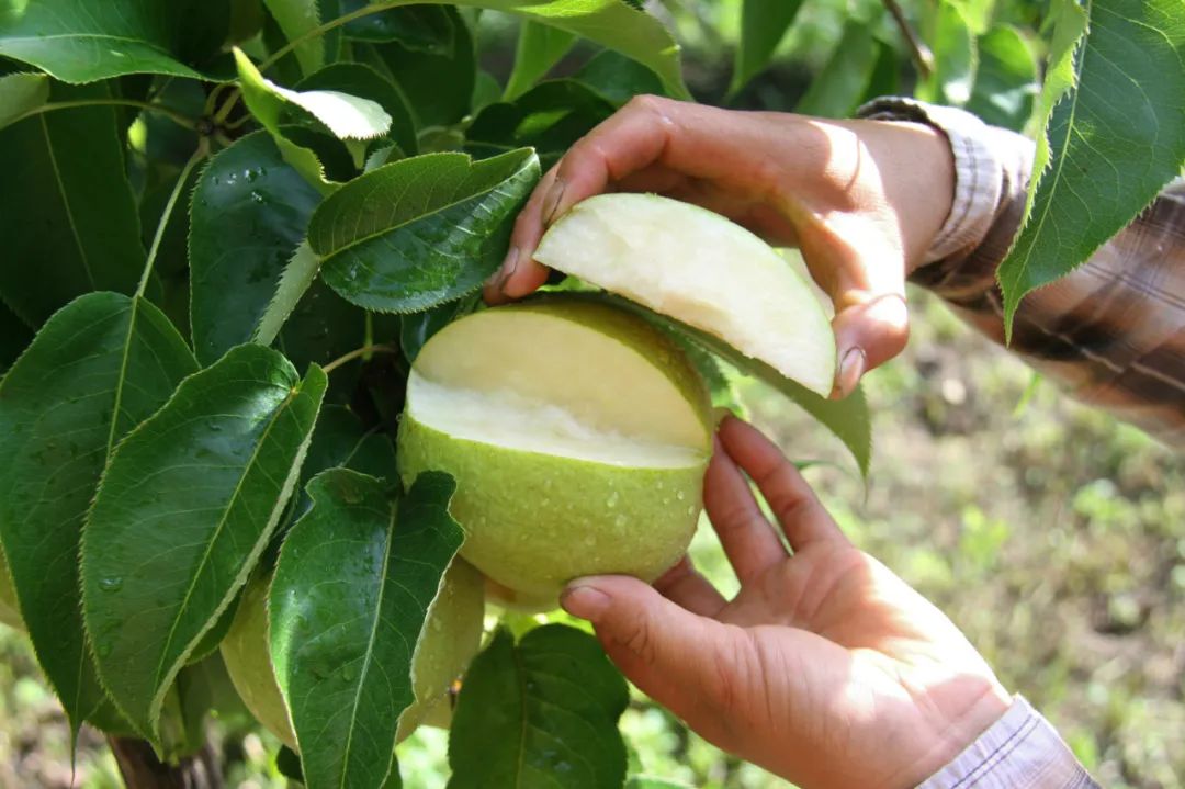 看看枝头,果实已然成熟,老朋友蜂糖梨来得比往年早些,青翠欲滴的外表下,藏着洁白如玉的细腻果肉,1分酸,9分甜的蜂糖梨,勾起了人们的味蕾。
