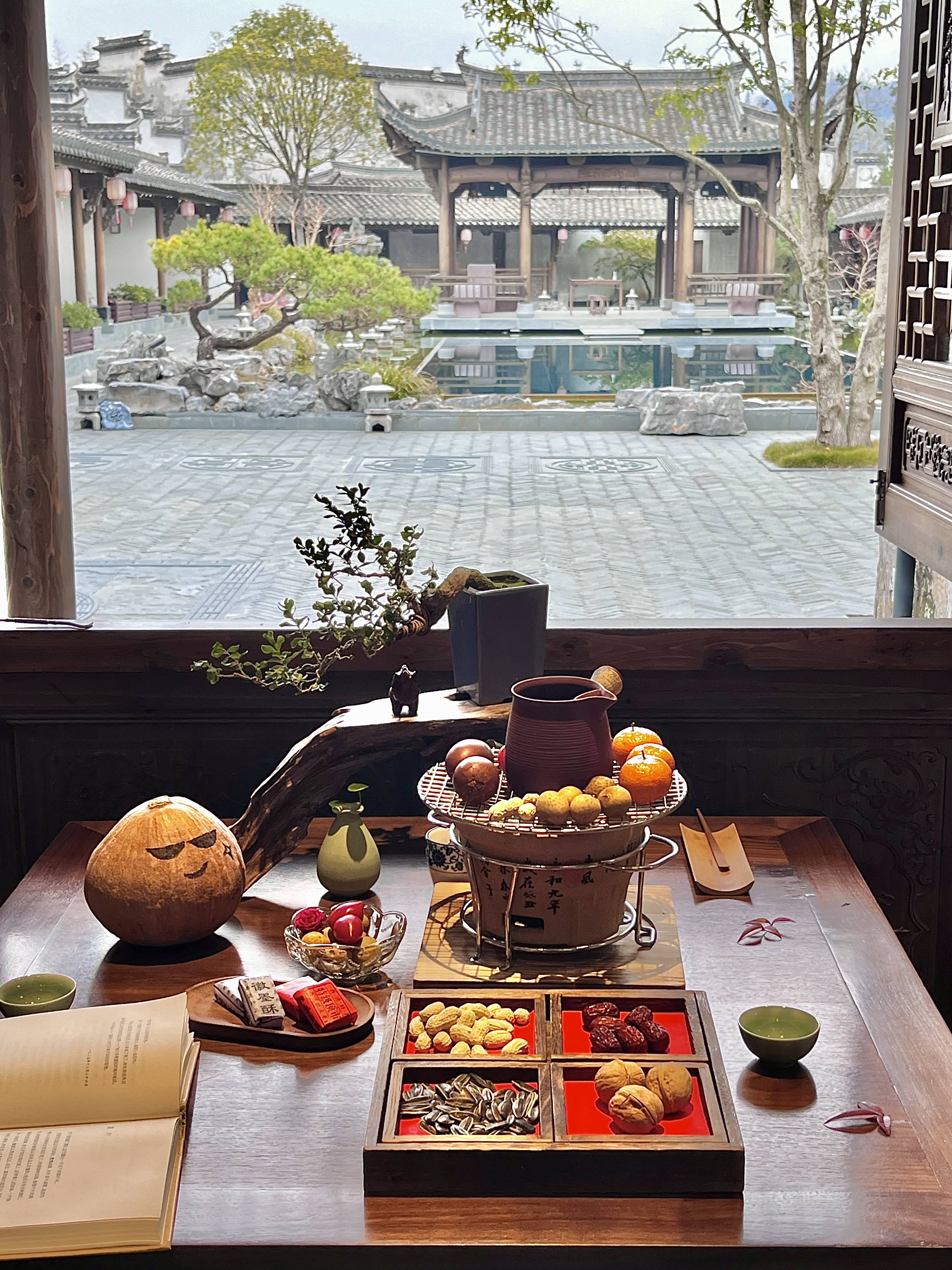 城市里的围炉煮茶只是氛围感,而在徽州古村西递,陶罐火炉和白墙黛瓦天生契合。