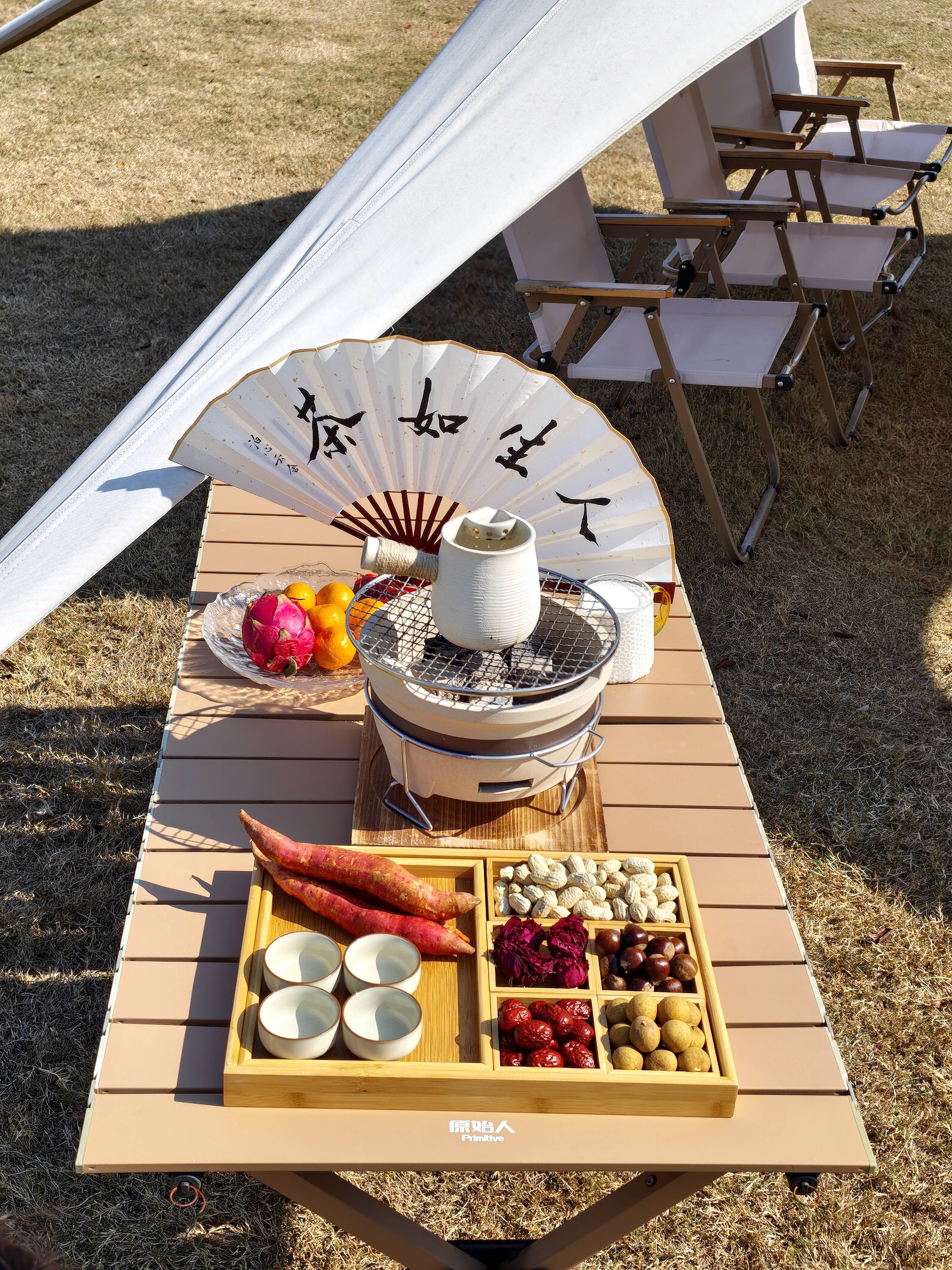 开阔的草地上支起天幕,几张折叠椅,围着一炉待热的炭火,露营的气氛就到位了,但比在郊外或公园更舒适的,是这里的清静。
