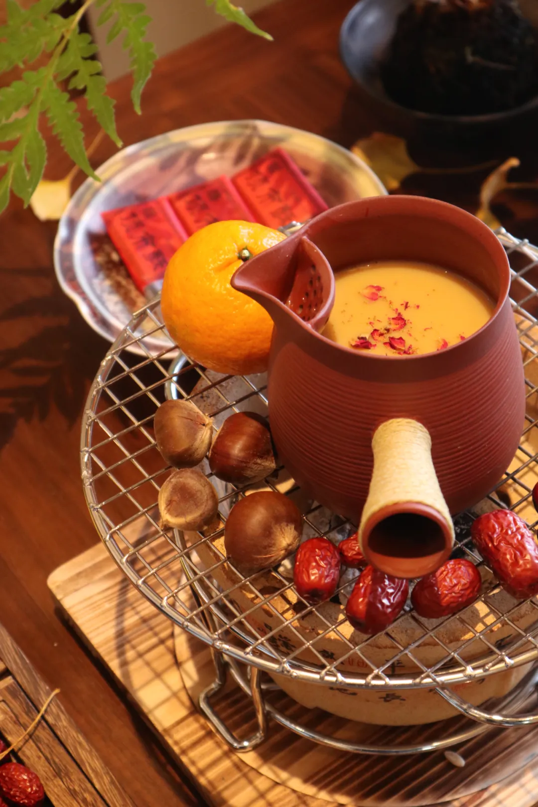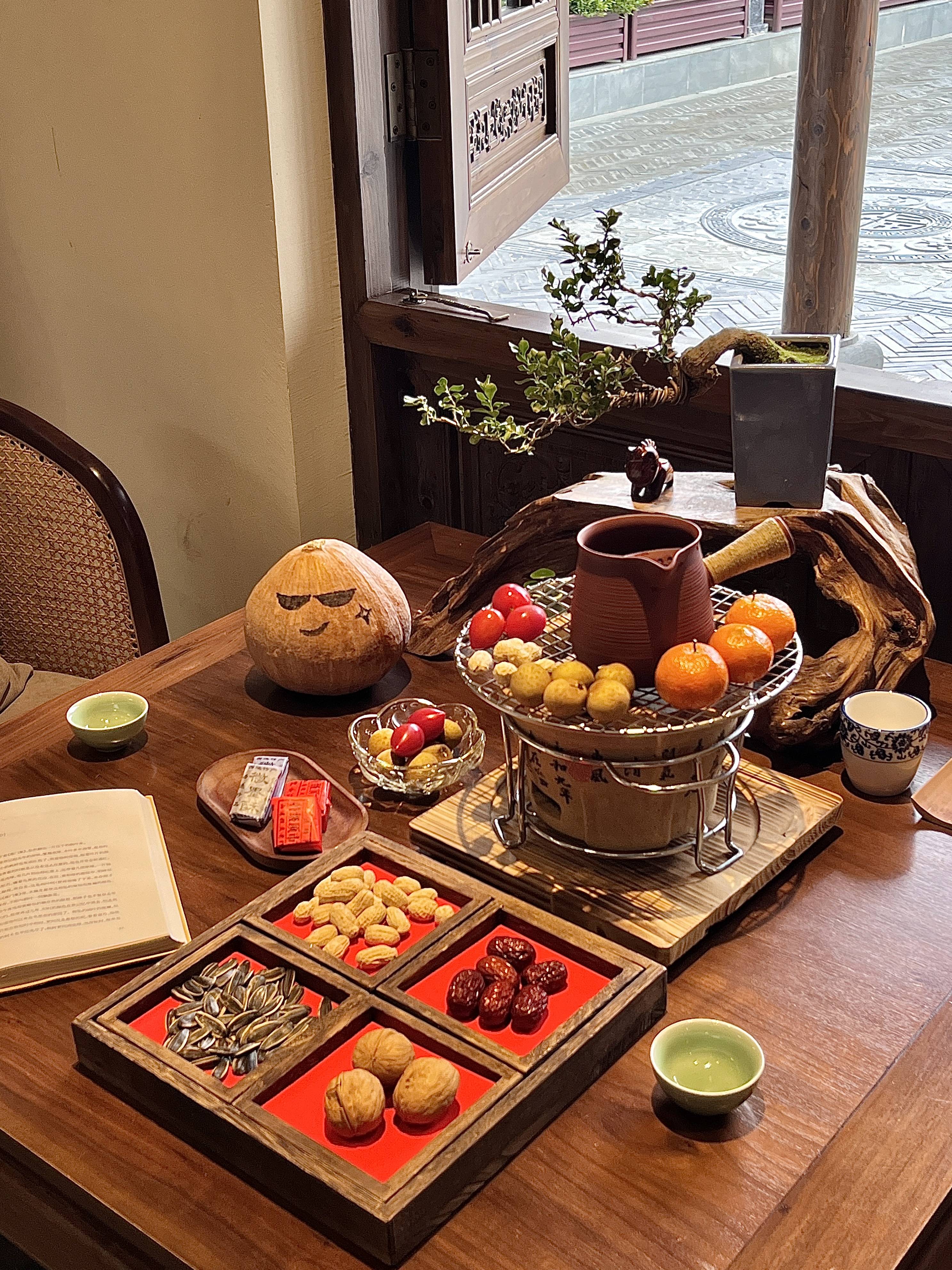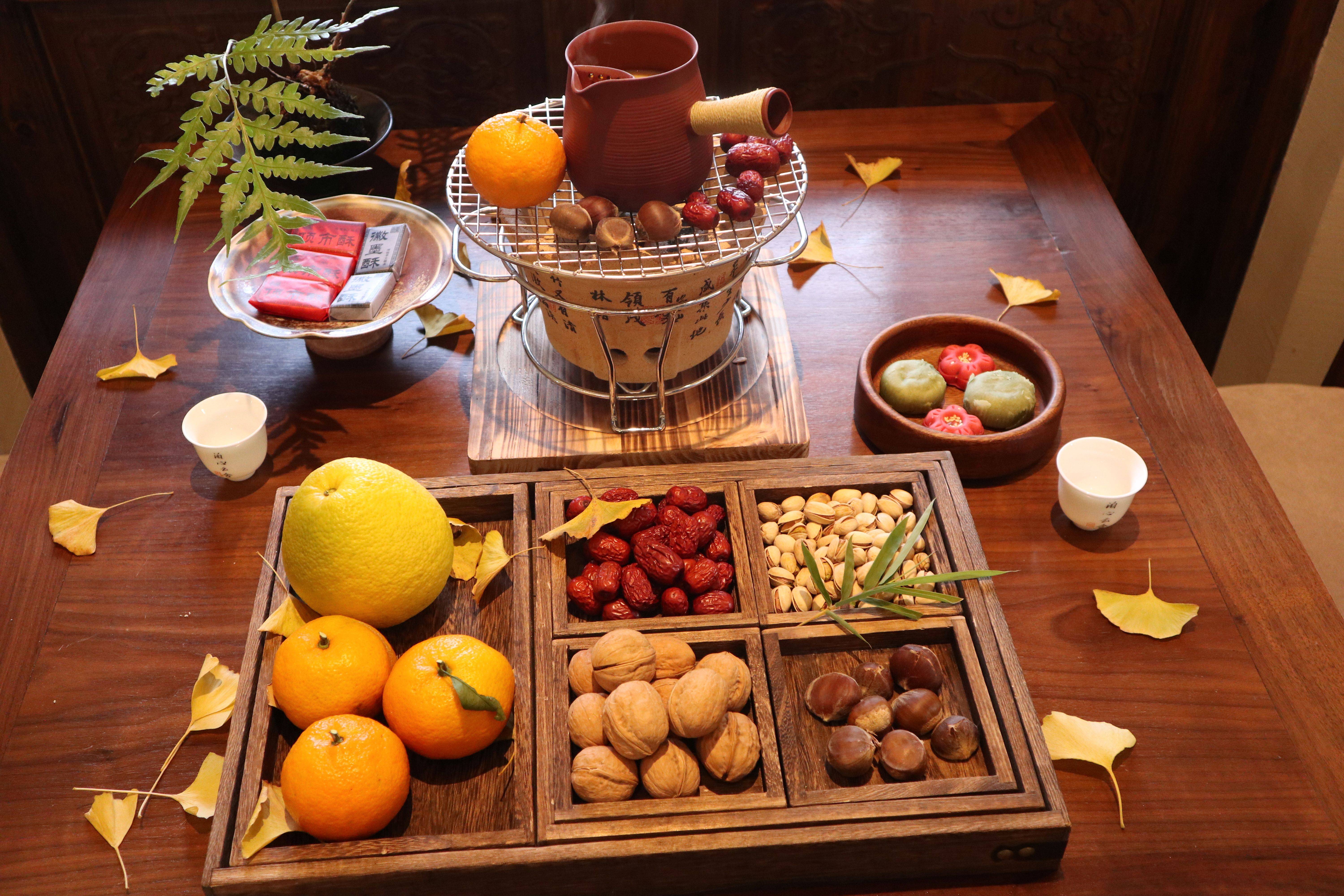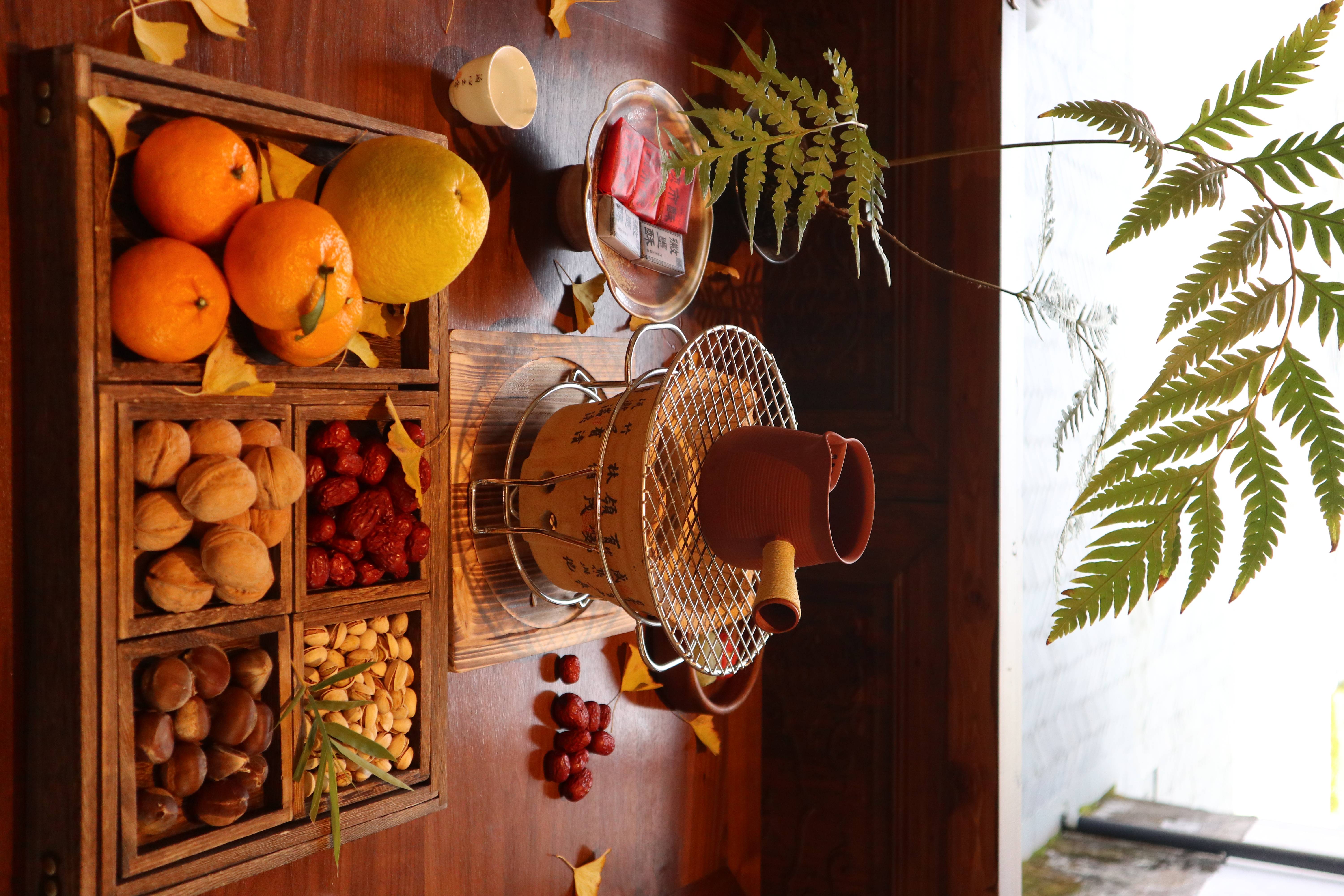 桌上陶罐煨着滇红,干果也围着茶炉加热。炭火噼啪,茶香袅袅,待坚果外壳微微鼓起,啪嗒一声裂开,就是它的最佳赏味期。