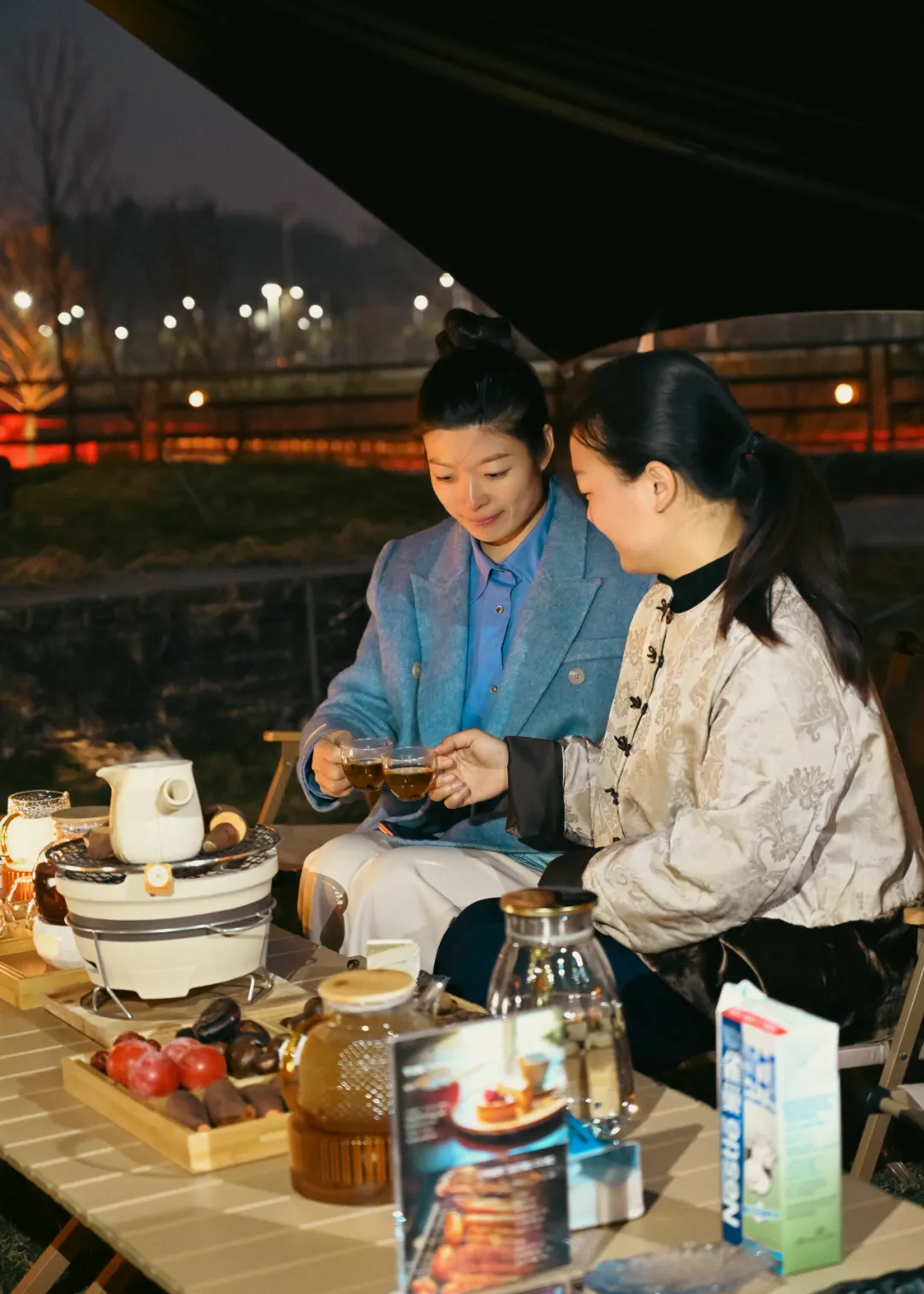 如果说西递的围炉煮茶是沉浸在历史中的文化体验,那么新余泊心云舍·七夕岛则提供了一种全然不同的湖畔隐奢露营风情。