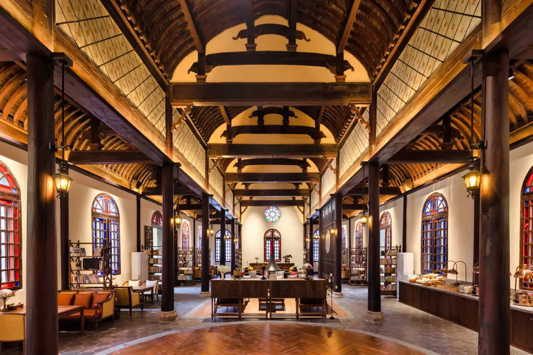 如今,它是泊心云舍·徽圣堂民宿静美的大堂。人走进去,蓦然被光影拥抱,从日出到日暮。坐在那里,能看见光缓缓移动。从东墙到西墙,不过一个白日;而从天主教堂到排练场,再到今日的民宿,已是一百五十多年的往事。所有喧嚣与寂静,所有远渡重洋的执着与本地工匠的刀笔,所有铿锵的故事与戏文的余音——都在这光影的流动里,轻轻沉降下来,化作一片温存的、绚烂的宁静。