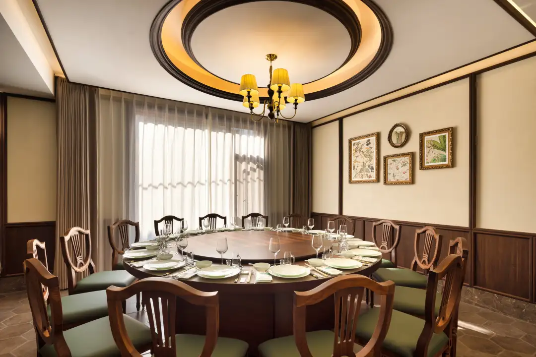 最深处藏着一间民国风雅的包房,可容十五人围坐——昏黄的灯、深沉的木、墙上朦胧的画,时光在这里自觉地退后了几步,留出一段专供慢斟细酌、私语倾谈的完整光阴。菜肴的香气与砚池的水汽轻轻交融,竟分不清滋养身心的,是笔墨,还是烟火。