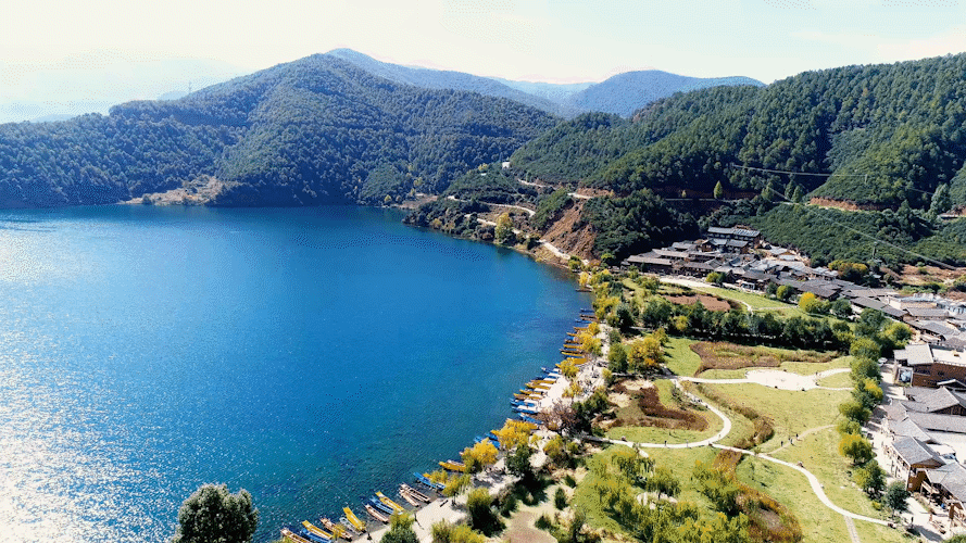 群山环抱的泸沽湖,仿佛一颗遗落山间的明珠,森林、岛屿、村庄静立其中,大片蔚蓝的湖水和蓝天交织在一起,让人一时分不清是现实还是梦境。